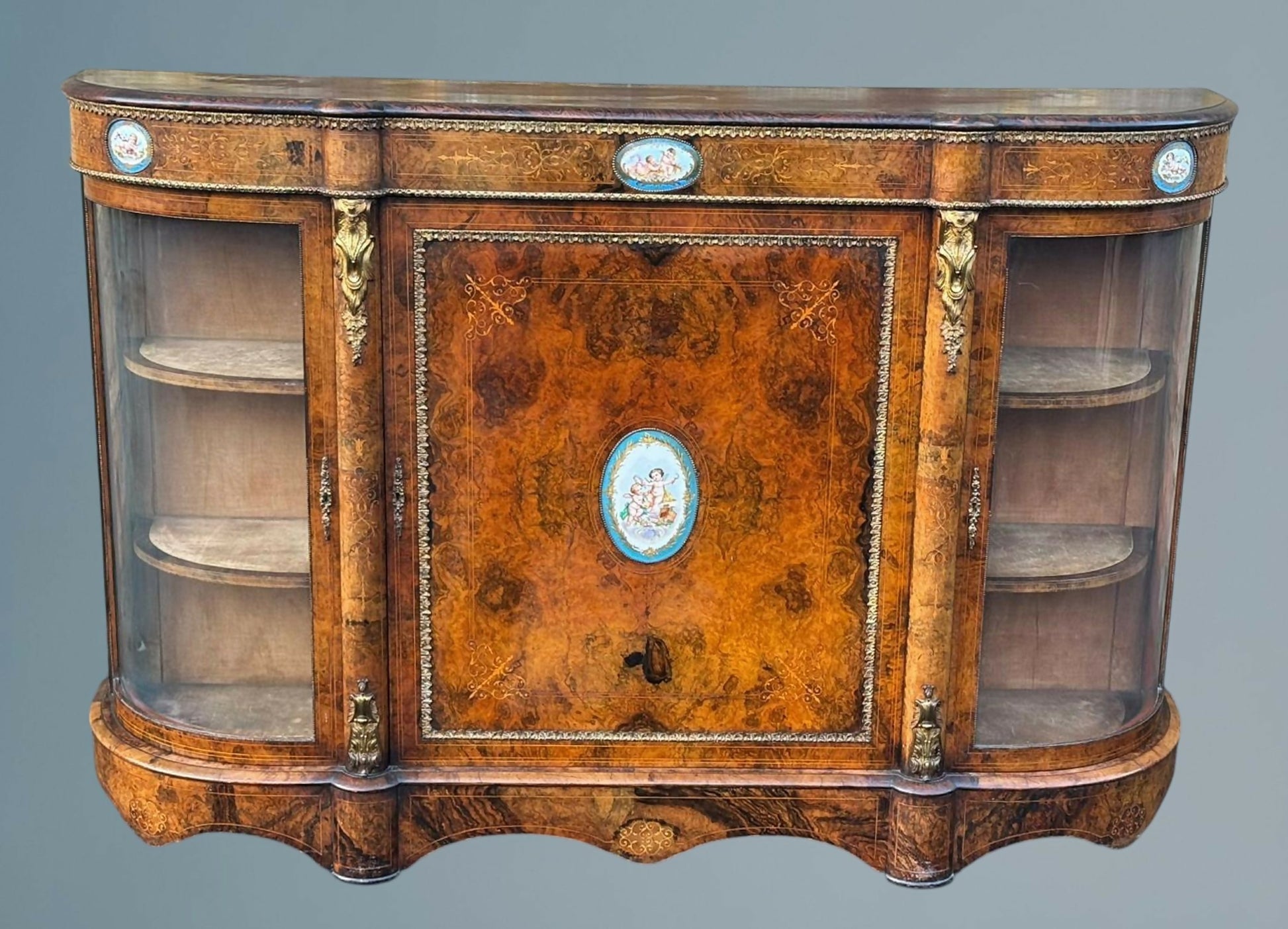 Victorian Inlaid Walnut Credenza Featuring Sevres Style Plaques