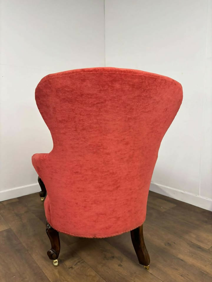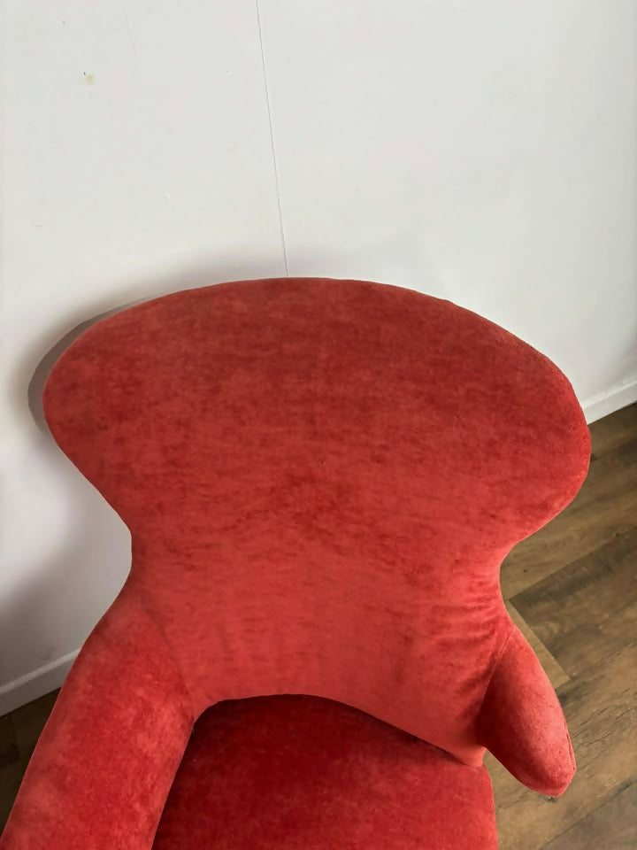 The chaise is upholstered in a pinkish-red fabric, which remains intact and presentable, offering comfortable seating or reclining. The overall form is light and refined, allowing the piece to sit comfortably in a wide variety of interiors, from traditional to more eclectic settings.