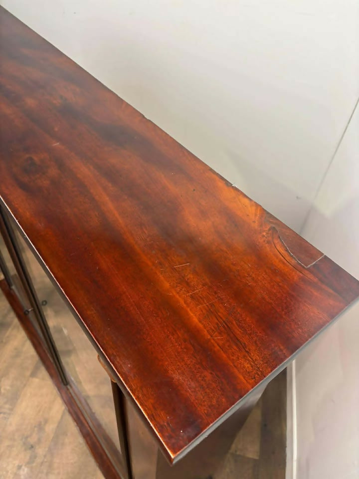 A charming Victorian mahogany bookcase with twin glazed doors and classic carved detailing, offering elegant display space and warm period character. Compact, practical, and ideal for books, collections, or decorative storage.