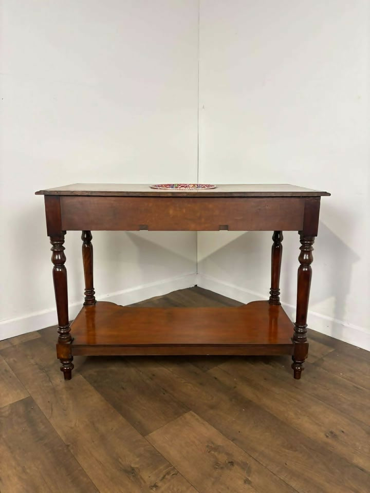 The piece stands on elegant turned legs and is united by a shaped under-tier shelf, providing additional storage while enhancing the overall balance and design.