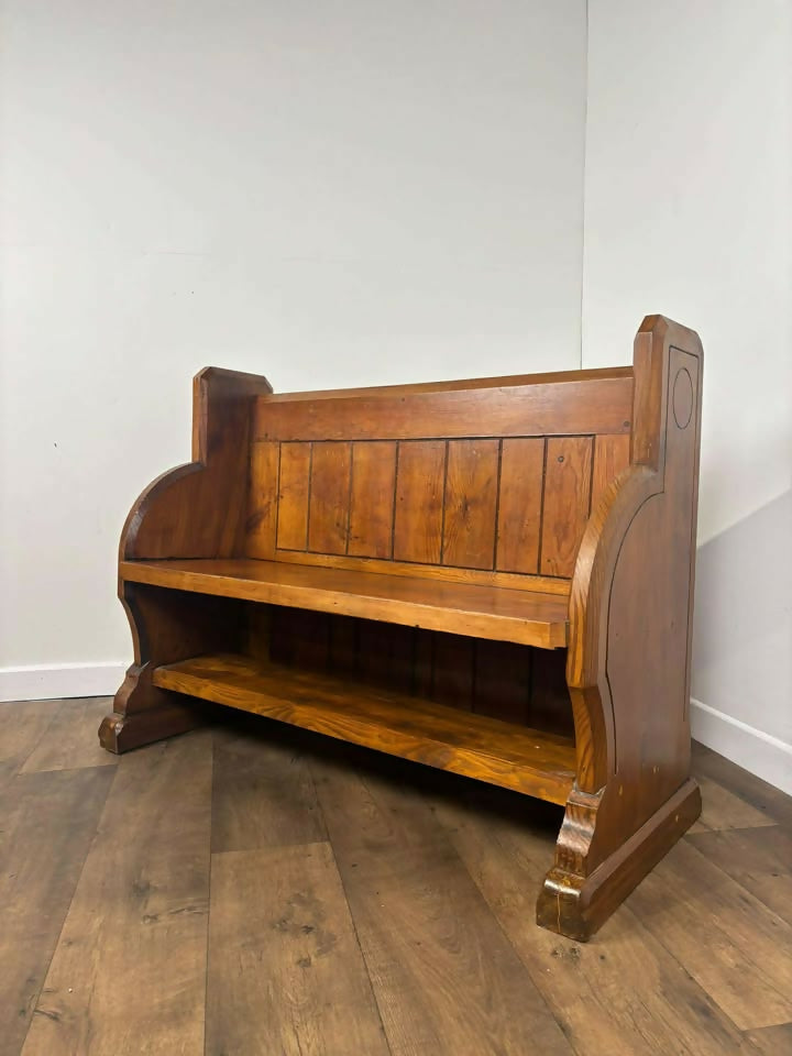 A charming Victorian pitch pine pew of smaller proportions, well constructed and of considerable weight. The piece has a pleasing, well-balanced form, with shaped ends and a panelled back, displaying the rich colour and grain typical of pitch pine.