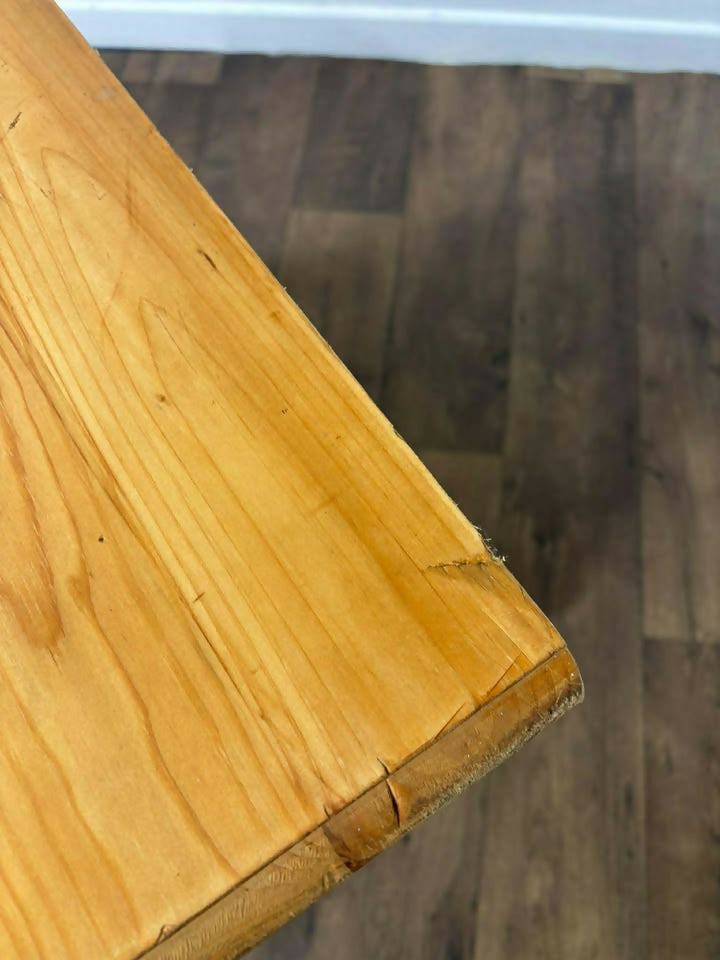 The pine has developed a warm, mellow tone, with honest signs of age and use, most notably to the top surface. These marks are entirely in keeping with the piece and enhance its period charm rather than detract. There is a small chip of wood to the back right hand top - see photographs.