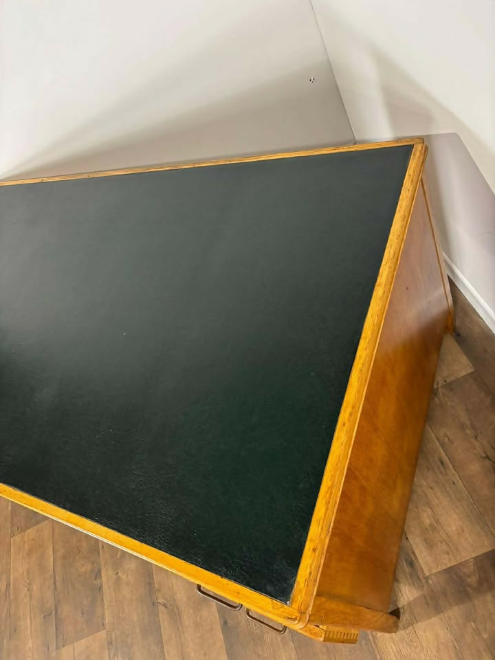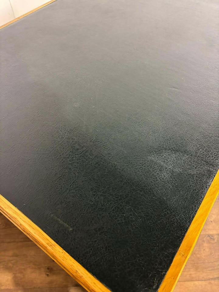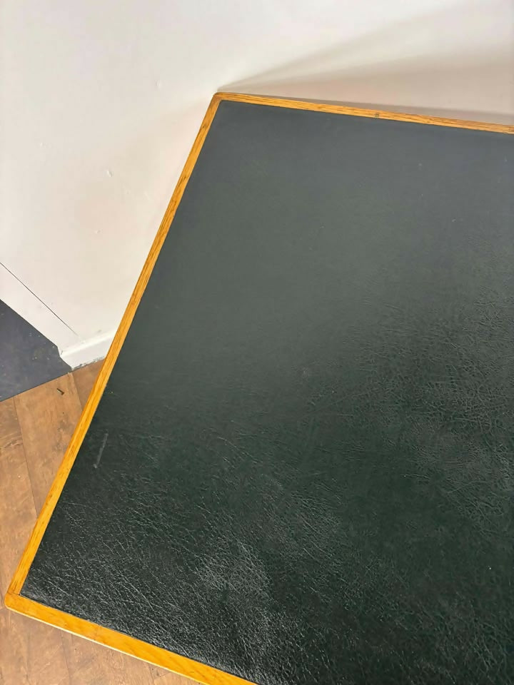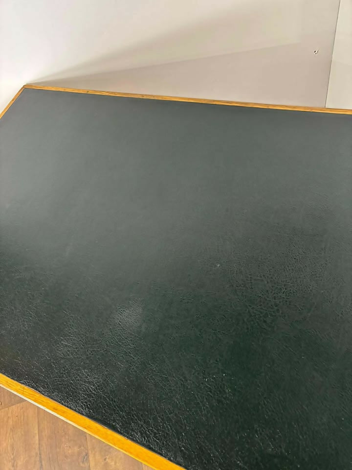 A classic vintage teacher’s desk in solid oak, featuring a deep green leather writing surface and a generously proportioned work area. Simple, functional, and full of character—ideal for home offices, studios, or anyone after a sturdy traditional desk with charm.