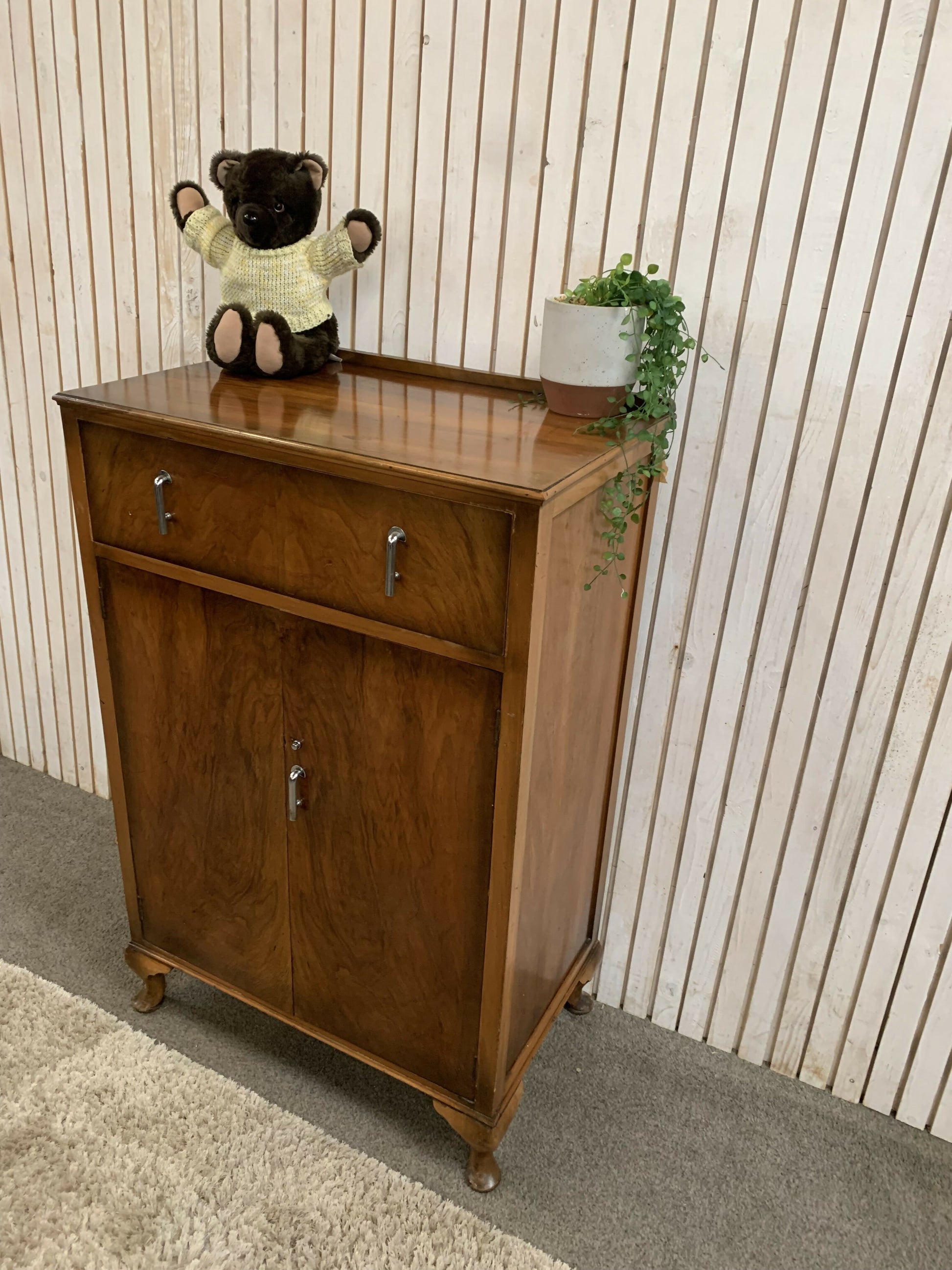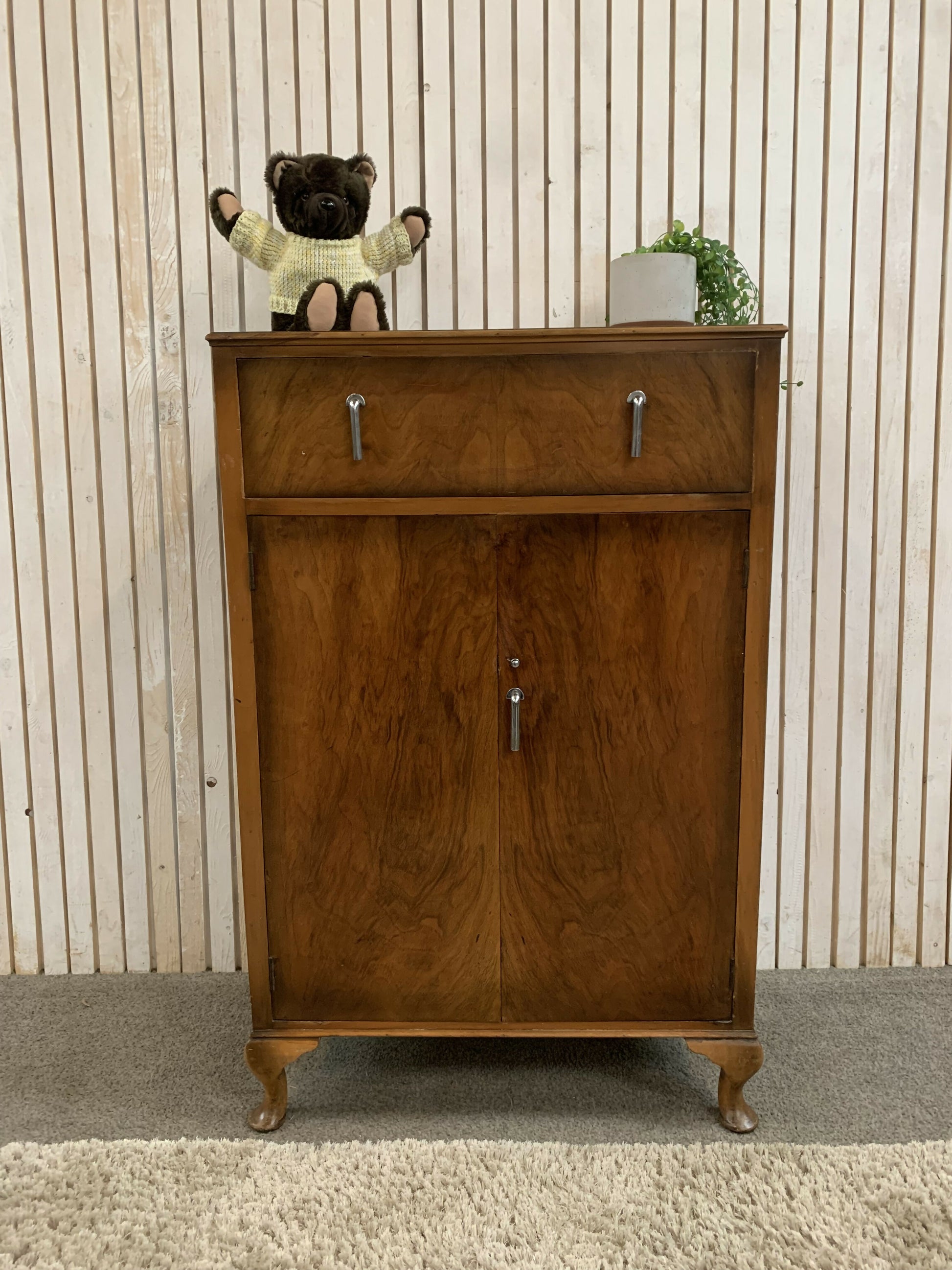 Vintage Art Deco burr walnut veneer cupboard featuring two doors and one drawer.
