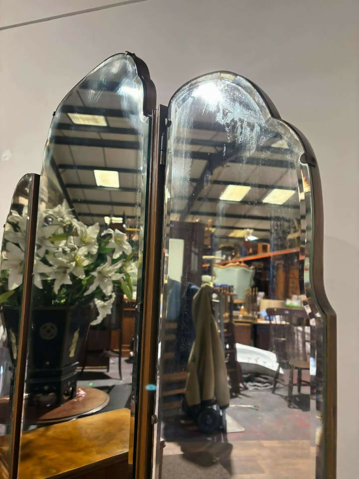 A graceful burr walnut dressing table with a beautifully shaped triple mirror and elegant cabriole legs. The figured walnut veneer displays a rich patina and warm honey tones, showcasing the natural beauty of the wood — a highly desirable look that’s very much in vogue.