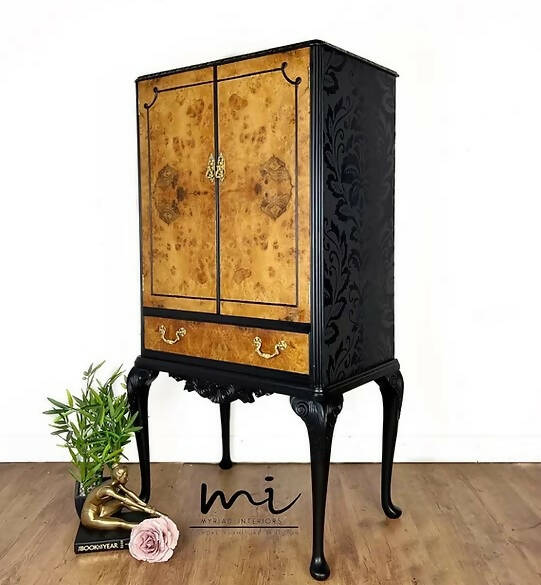 Her sides have been decoupaged with a textured black paper with a gorgeous baroque design to match the detailing on the beautiful Queen Anne legs. After being stripped back the doors revealed they had a striking grain so these have been left bare and treated with an oil wax to nourish and protect.