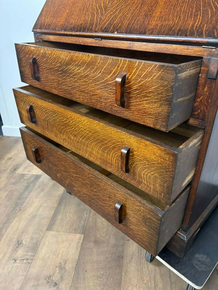 Below the writing section are three full-width drawers, all of which run smoothly and are fitted with matching oak handles. The drawers are clean inside and provide generous storage, making the piece both decorative and highly functional.