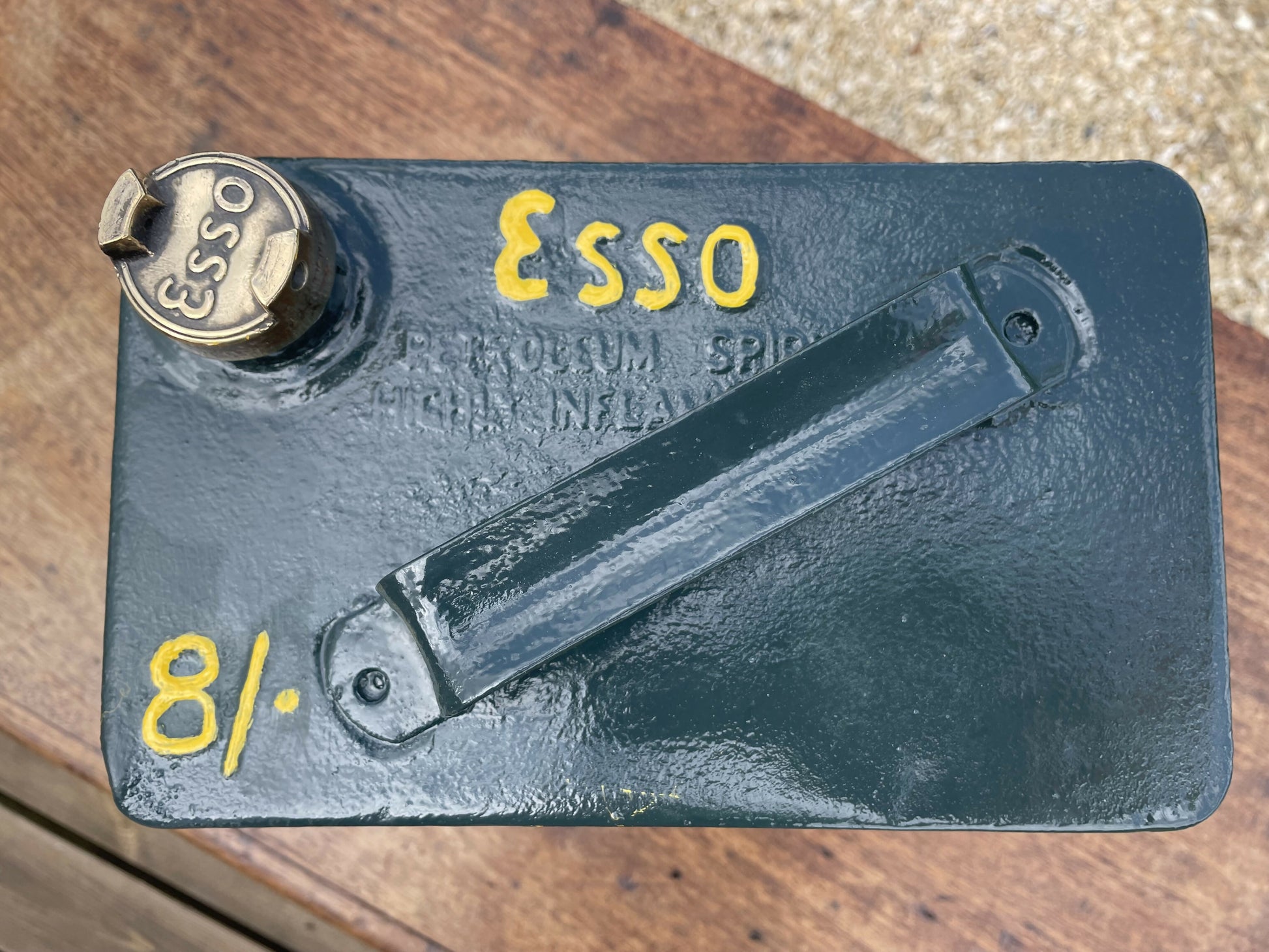 Vintage ESSO Fuel Can complete with original polished brass cap. Ideal man cave, advertisement prop, classic car, garage etc. Has been repainted in Metal paint Forest green and sign written on one side, one front and top so it can be displayed with or with out the yellow writing if required. No longer suitable to hold fuel in my opinion so selling as a decorative display item.