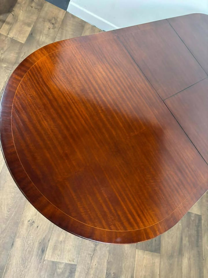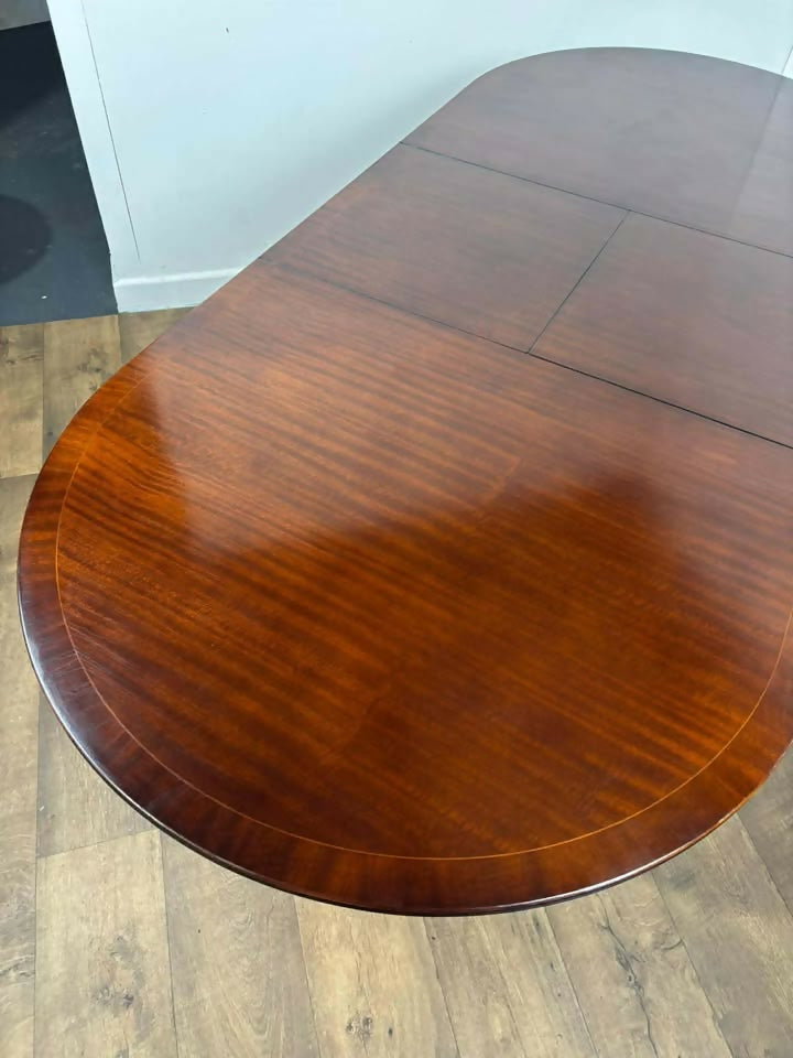 A handsome vintage reproduction mahogany extending dining table by Beresford & Hicks Limited, of classic traditional form and raised on two elegant triform pedestal bases. The table displays a rich, warm tone with attractive figuring to the top, enhanced by a refined banded edge that lends a particularly smart and formal appearance.
