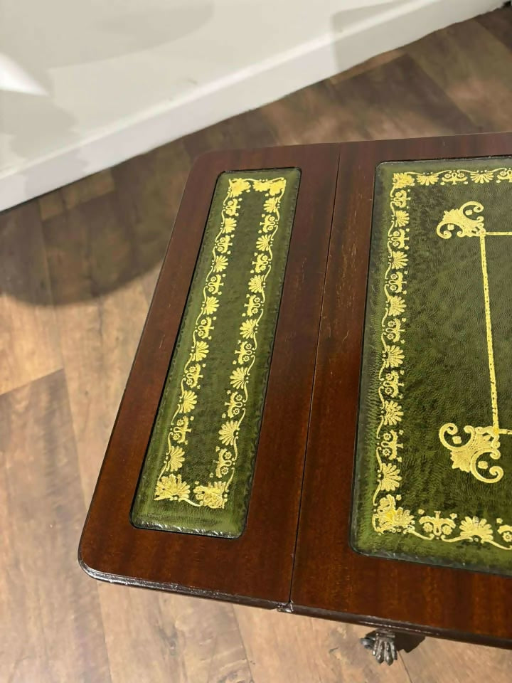 A charming vintage mahogany drop-leaf coffee table featuring an inset green tooled leather top with gilt decoration. The table includes a single drawer with a circular brass pull, offering both practicality and elegance in a compact form.