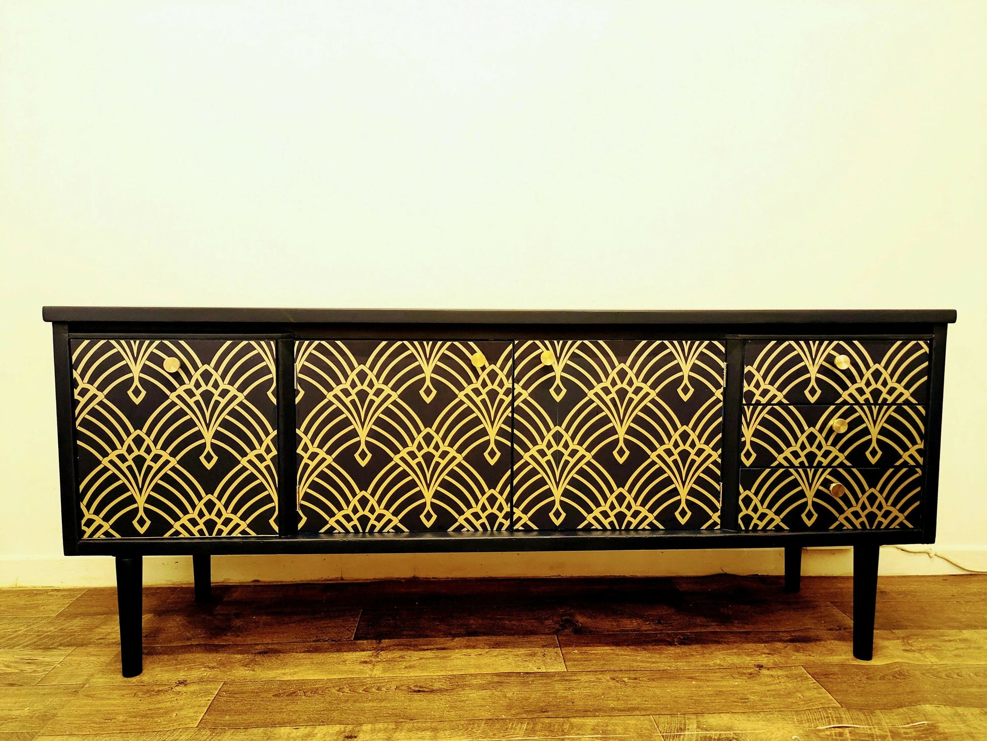 Vintage Midcentury Teak Sideboard: Navy & Gold Art Deco Cabinet