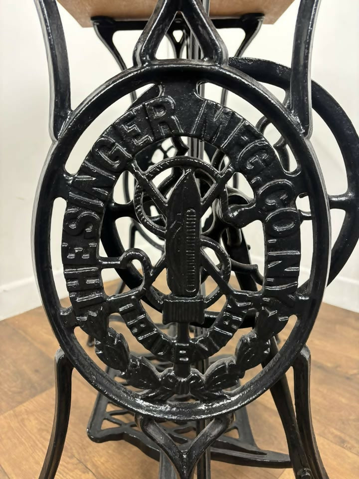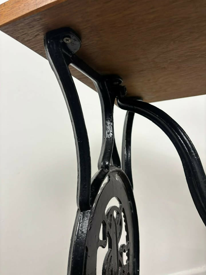 A striking and characterful vintage centre table featuring a solid oak rectangular top set on an original cast iron treadle sewing-machine base. A wonderful industrial-style piece that blends vintage charm with practical everyday use.