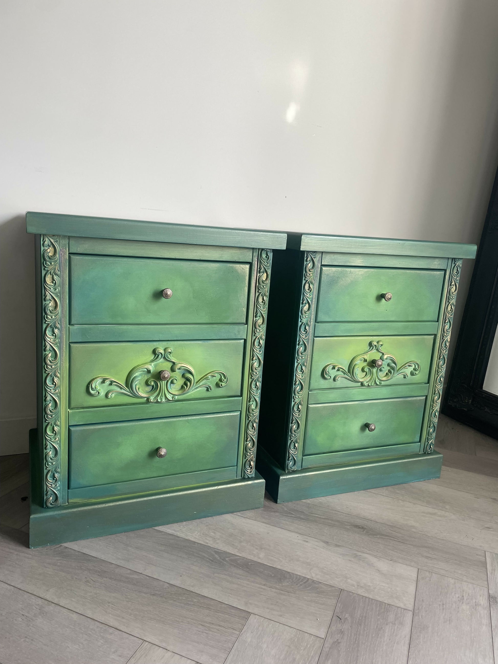Lovingly upcycled in rich tones of emerald and jade green, these unique nightstands feature intricate detailing and a soft, artistic finish that makes them truly one-of-a-kind.