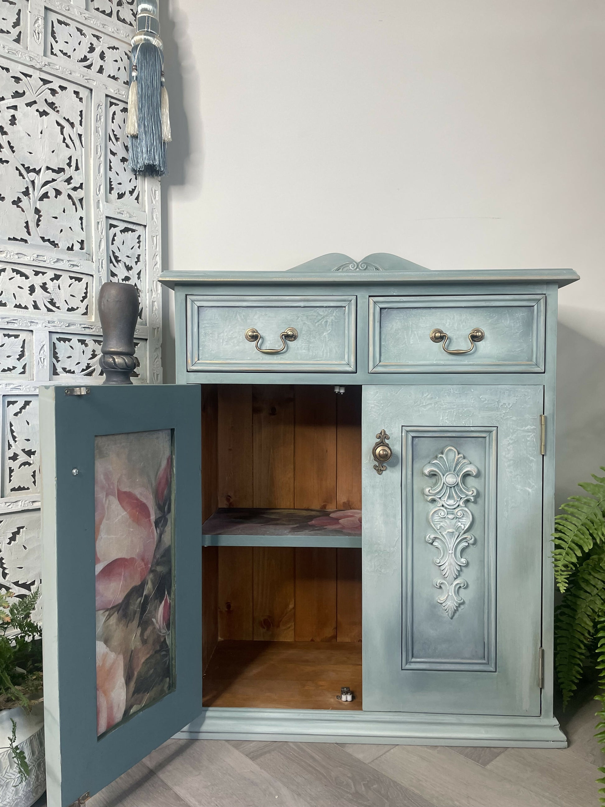 A beautifully hand-painted vintage solid pine cabinet, finished in soft blue/green with elegant raised detailing and a floral decoupage interior. This unique upcycled piece blends shabby chic charm with practical storage, perfect for adding character to any UK home.