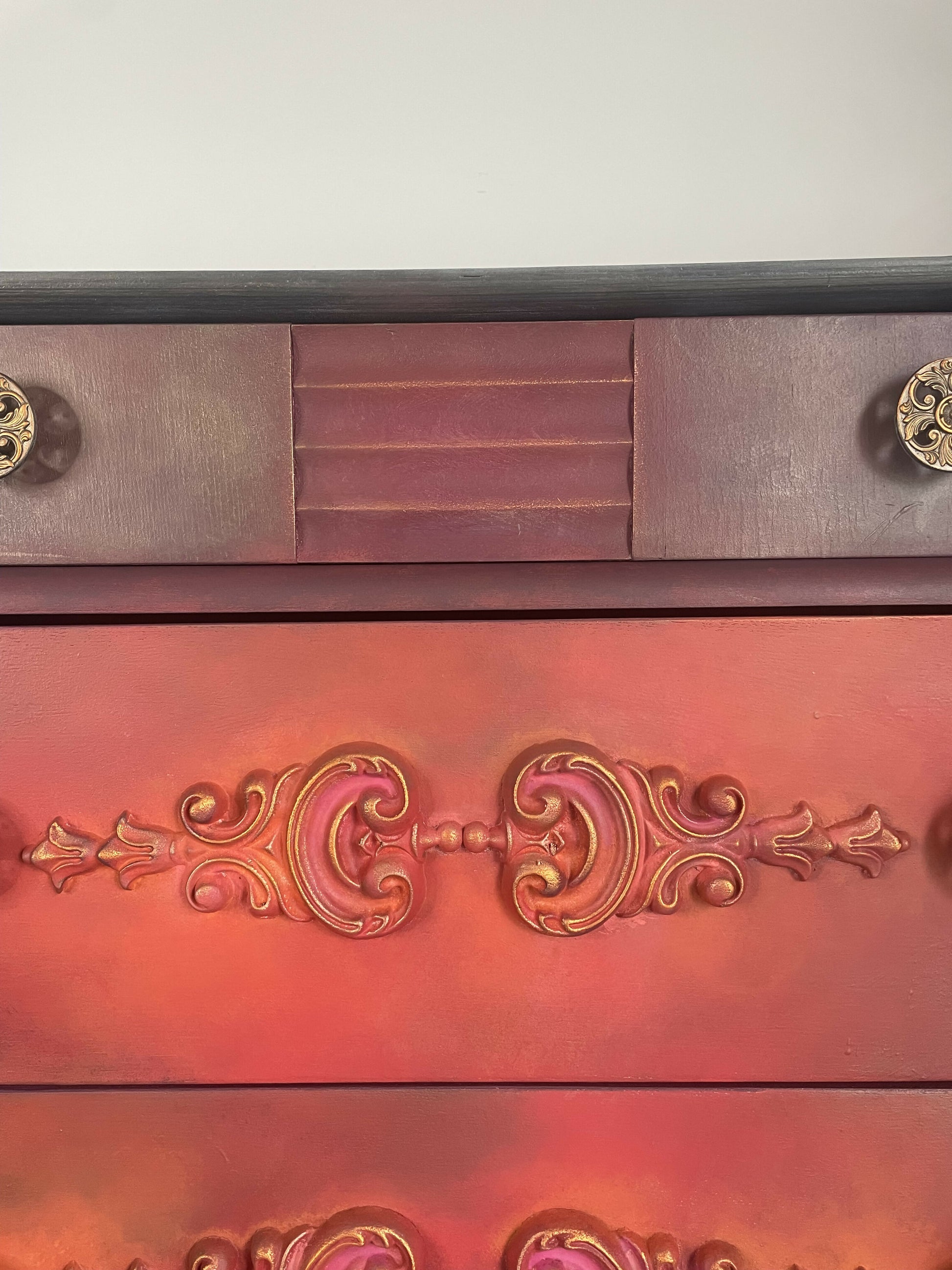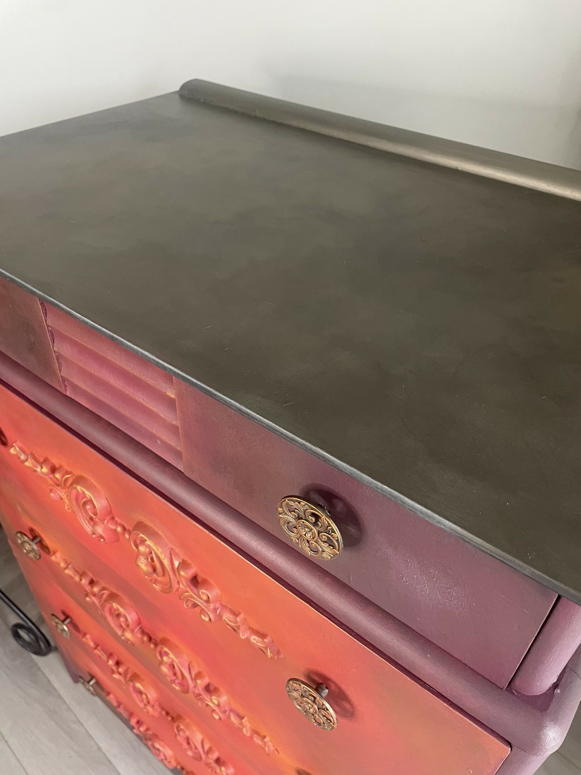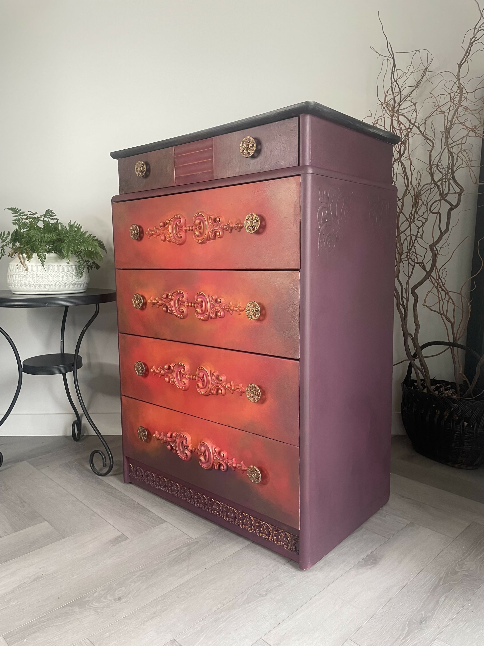 This chest has been transformed with a dramatic ombré blend and intricate raised mouldings for a bold, luxurious aesthetic. Perfect for bedrooms, hallways, living rooms, or as an eye-catching focal point in a boutique-style space. Drawer interiors are in good clean condition and have been re polished
