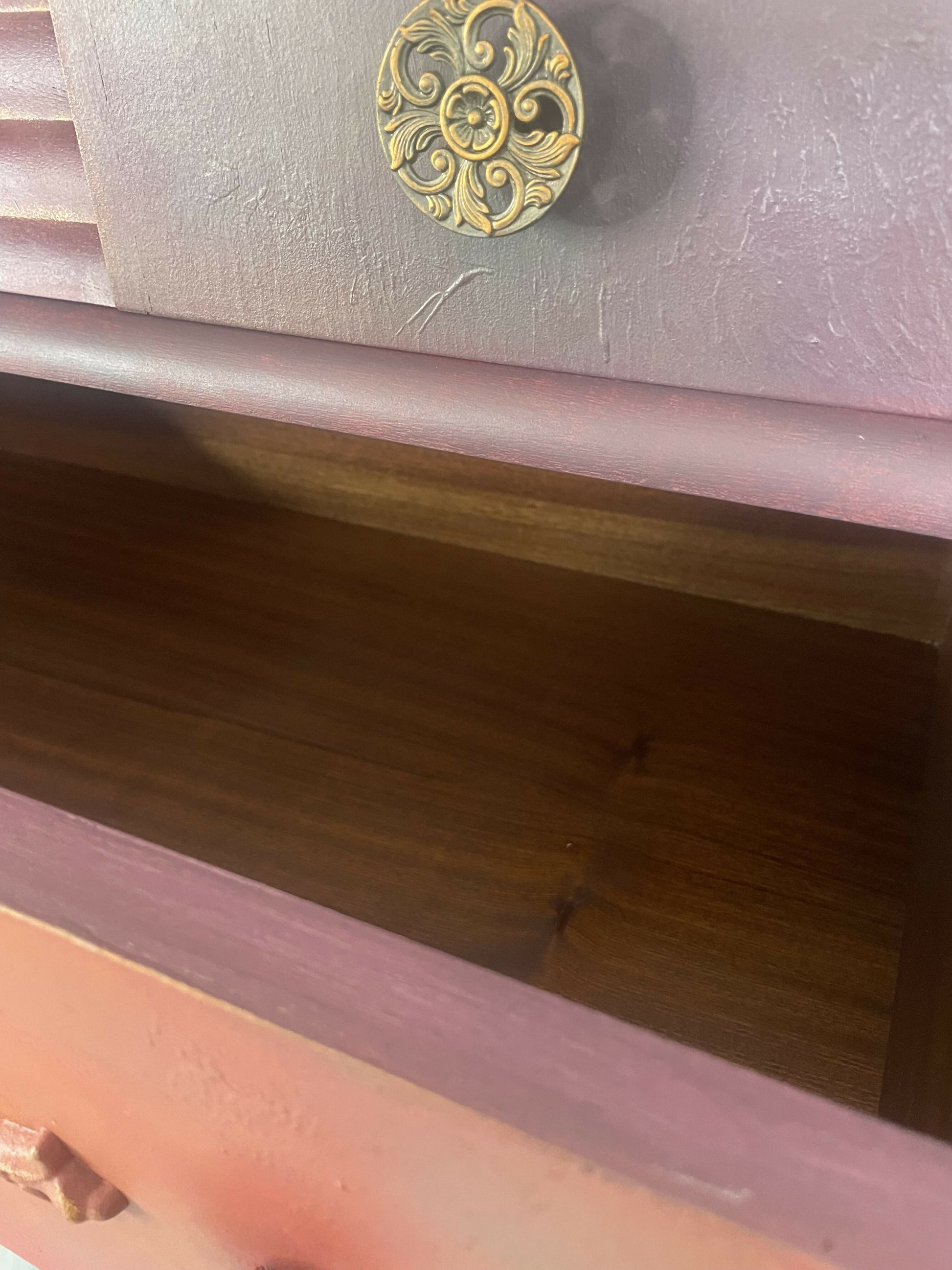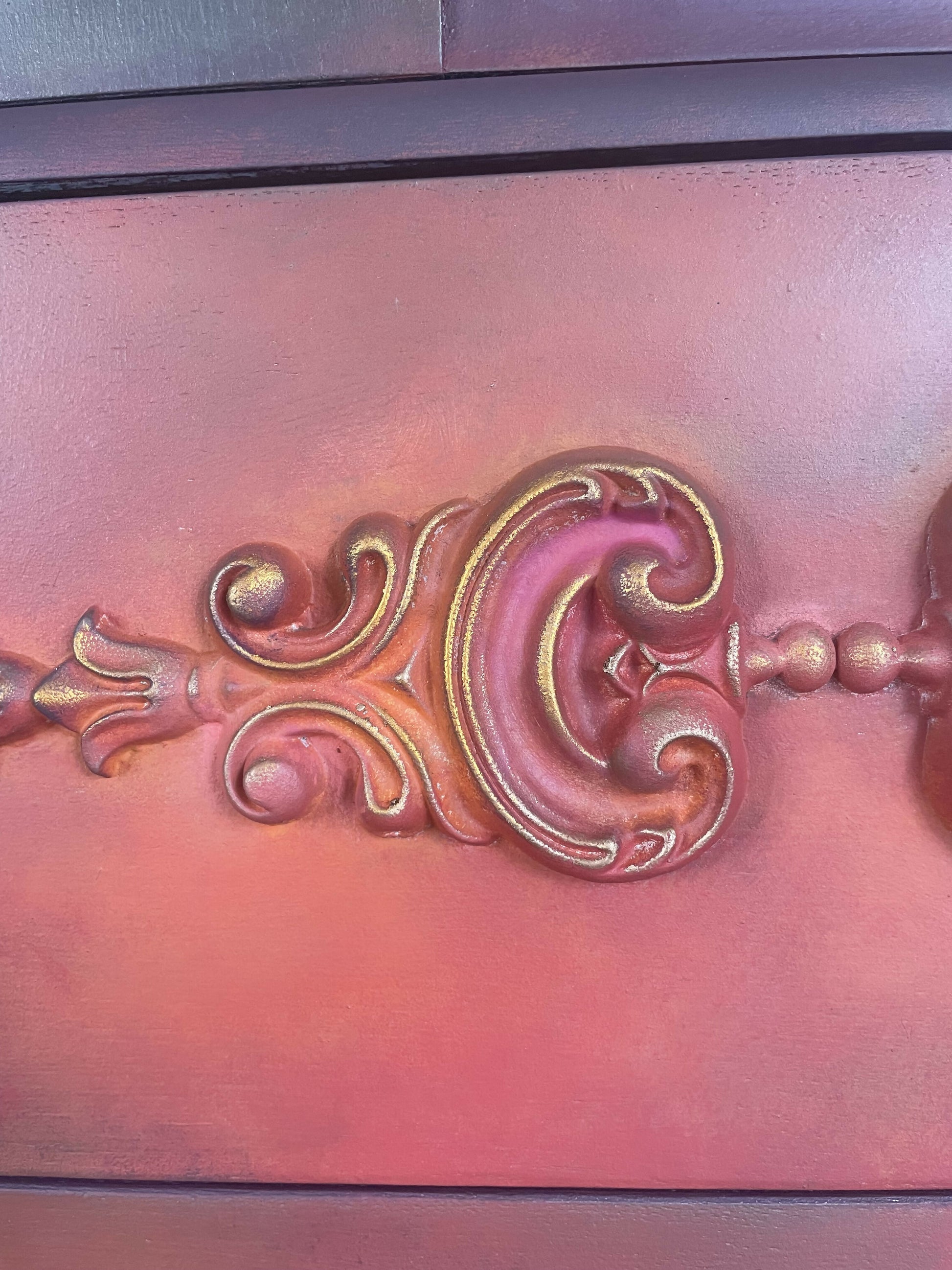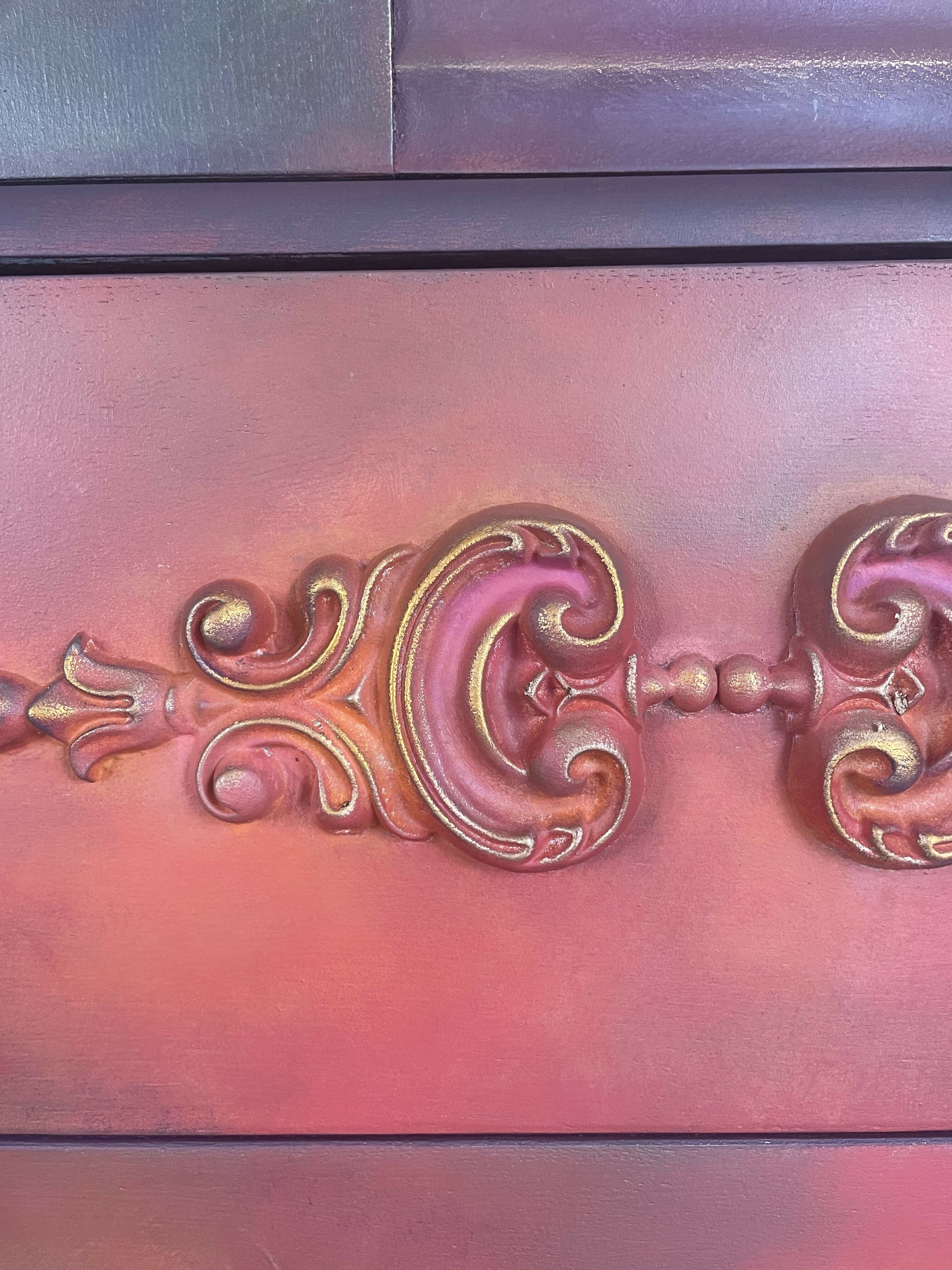 This chest has been transformed with a dramatic ombré blend and intricate raised mouldings for a bold, luxurious aesthetic. Perfect for bedrooms, hallways, living rooms, or as an eye-catching focal point in a boutique-style space. Drawer interiors are in good clean condition and have been re polished