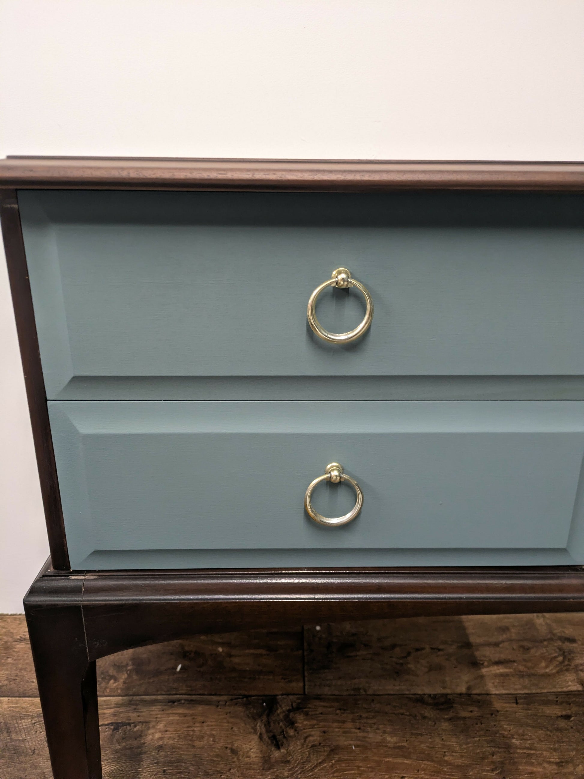 Give your bedroom a touch of vintage glamour with this beautifully refurbished Stag Minstrel dressing table or desk for a home office. Expertly restored with a stunning Blue Green painted drawers with the original elegant gold handles, this iconic piece features five spacious drawers for ample storage. The original handles have been cleaned and painted in a coordinating gold, while the drawer fronts have been hand painted. A perfect blend of classic design and modern style.
