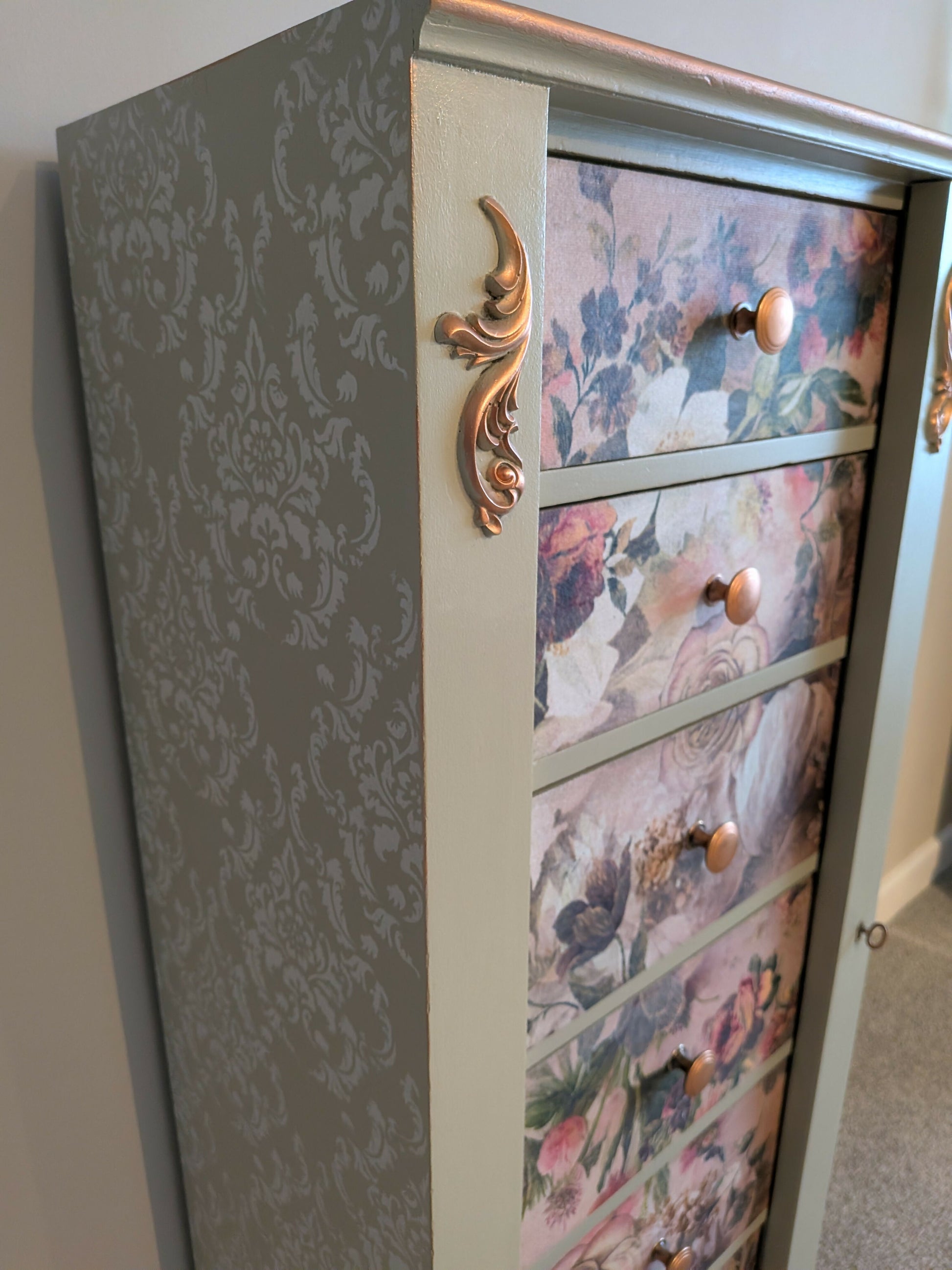 Painted a soft green with Fusion Paint ‘Eucalyptus’, the drawers have been wrapped with Redesign with Prima ‘Romance in Bloom’ decoupage and lined with a floral wallpaper. The sides of the tallboy and the drawers feature a delicate damask stencil design. The surface has been finished with a protective mid-sheen satin varnish, which gently reflects light. Rose gold wax has been used on hardware and to highlight ornate features.