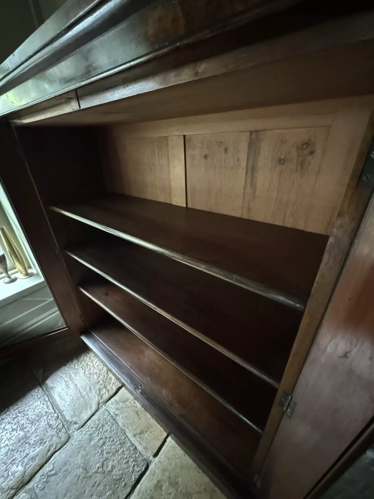 Lovely Antique Glazed Cabinet Bookcase in good overall condition. Three good solid shelves. Wear and tear commensurate with age. Some small chips to veneer - please see close up images. Please note the skirting is a different type of dark wood and not Burle walnut.