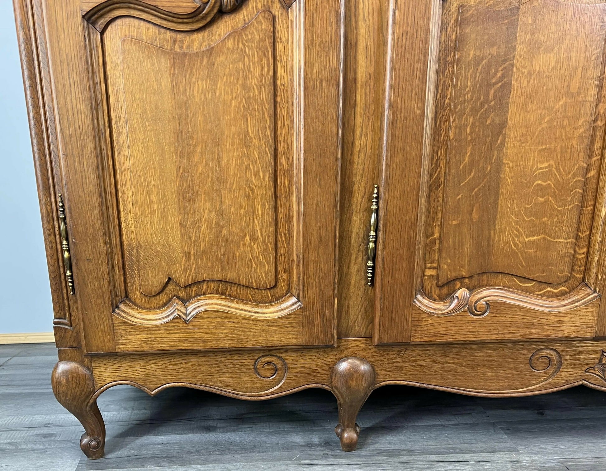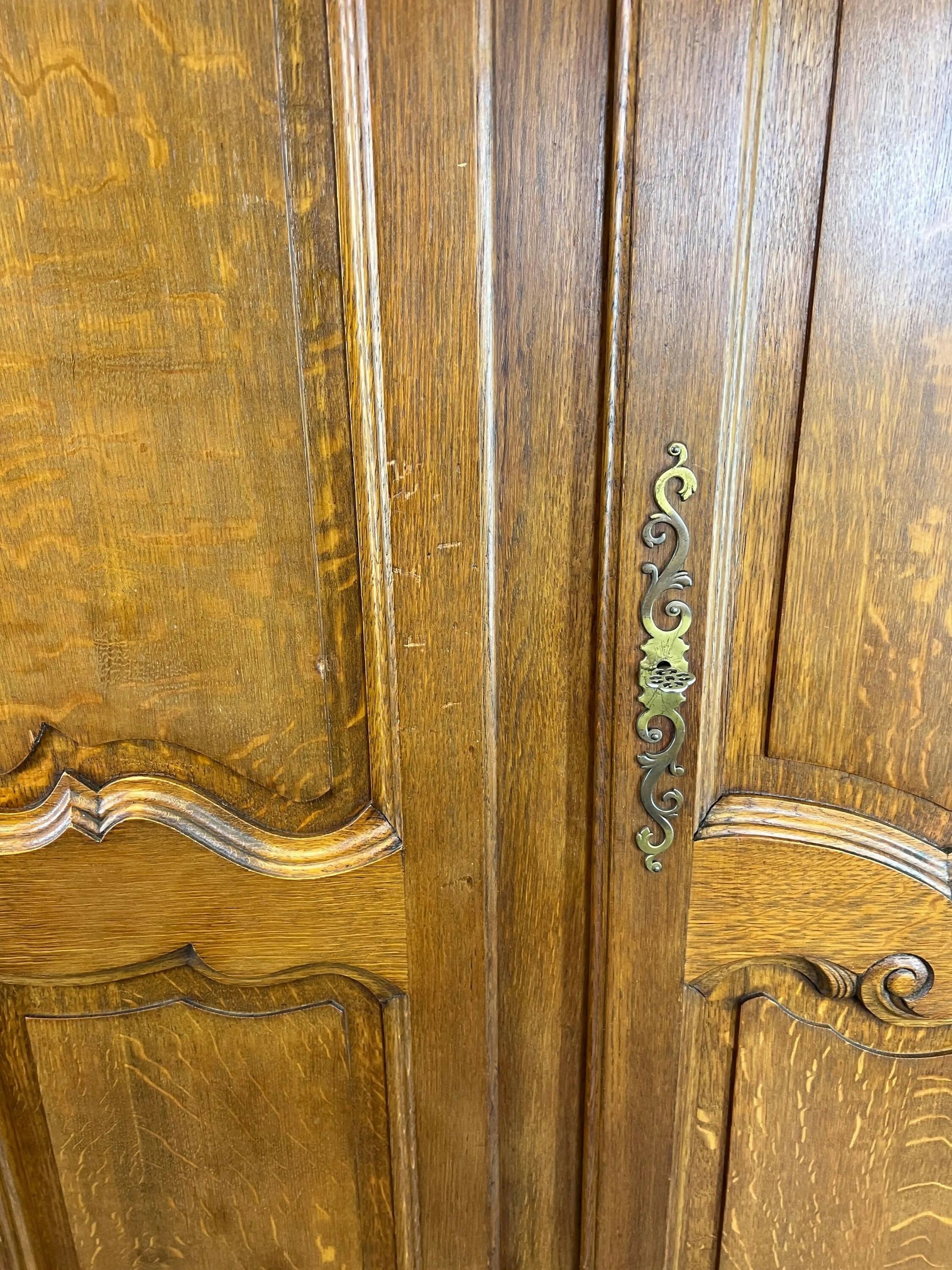 Crafted in oak wood, this wardrobe displays a gracefully curved cornice, panelled doors with classic Louis-style carved motifs, decorative brass escutcheons, and elegant shaped feet, highlighting the natural grain and character throughout.