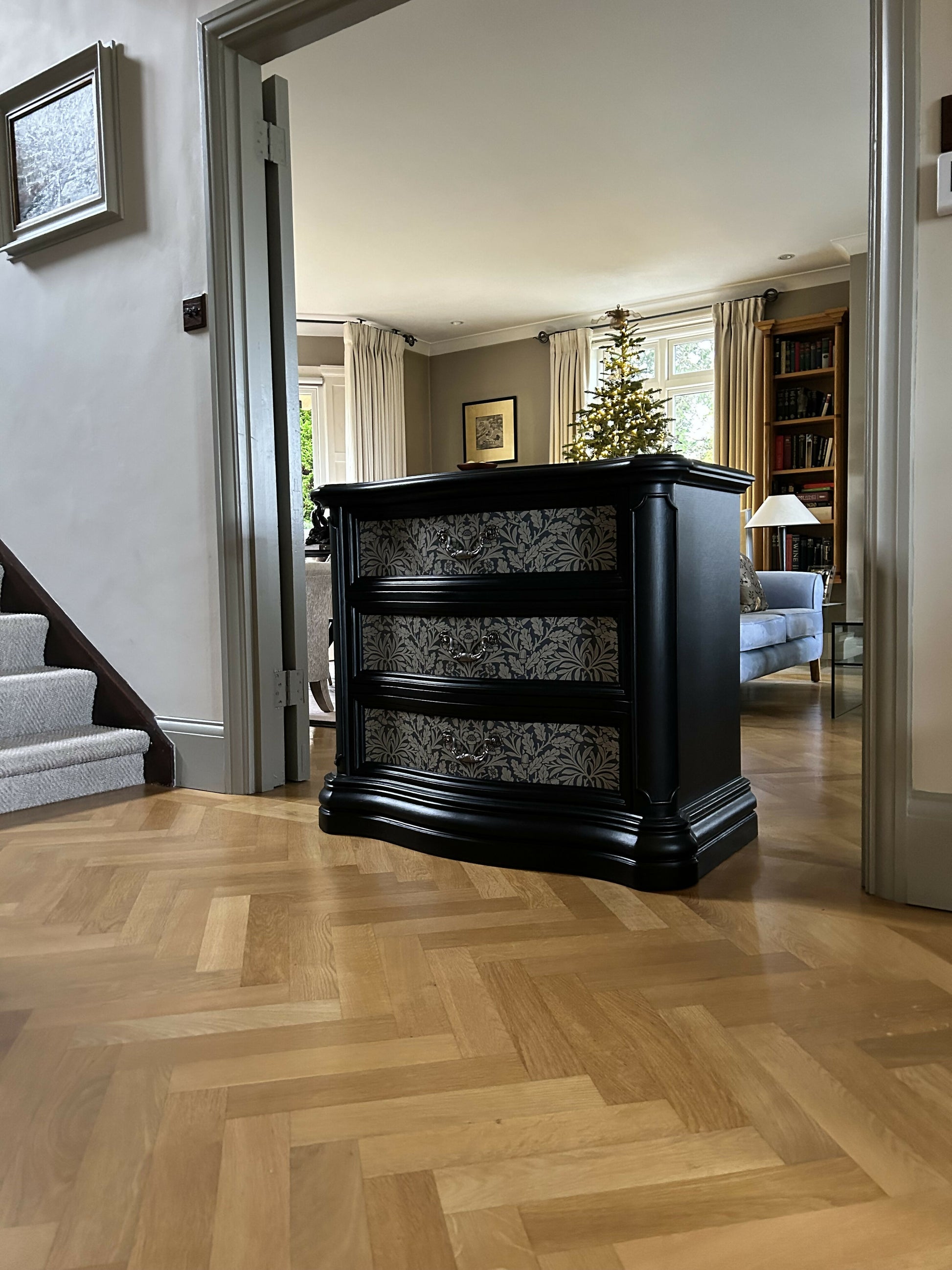 I have used an extra durable black mineral paint which has a lovely, soft sheen and the wallpaper is a William Morris design, which is extremely popular.
