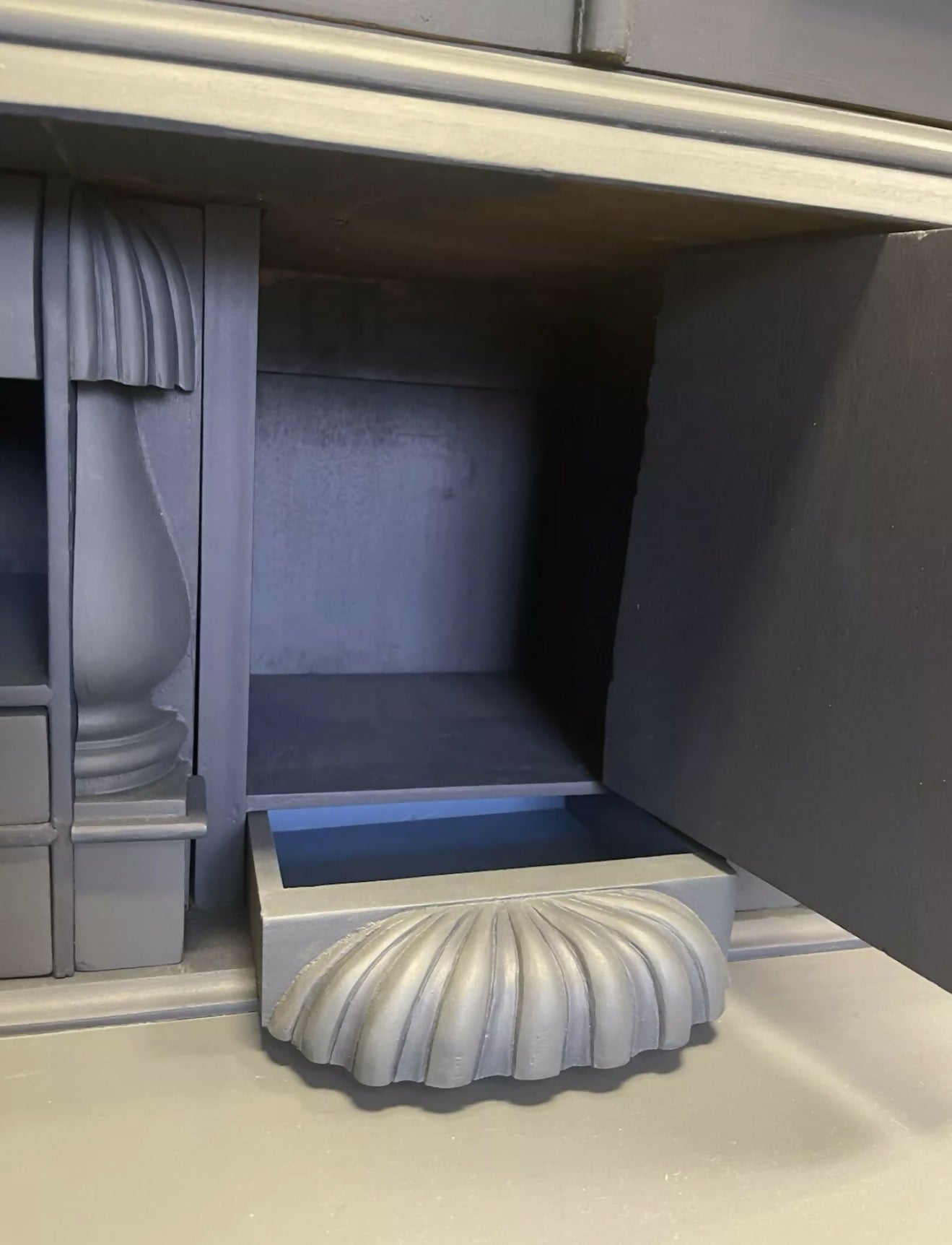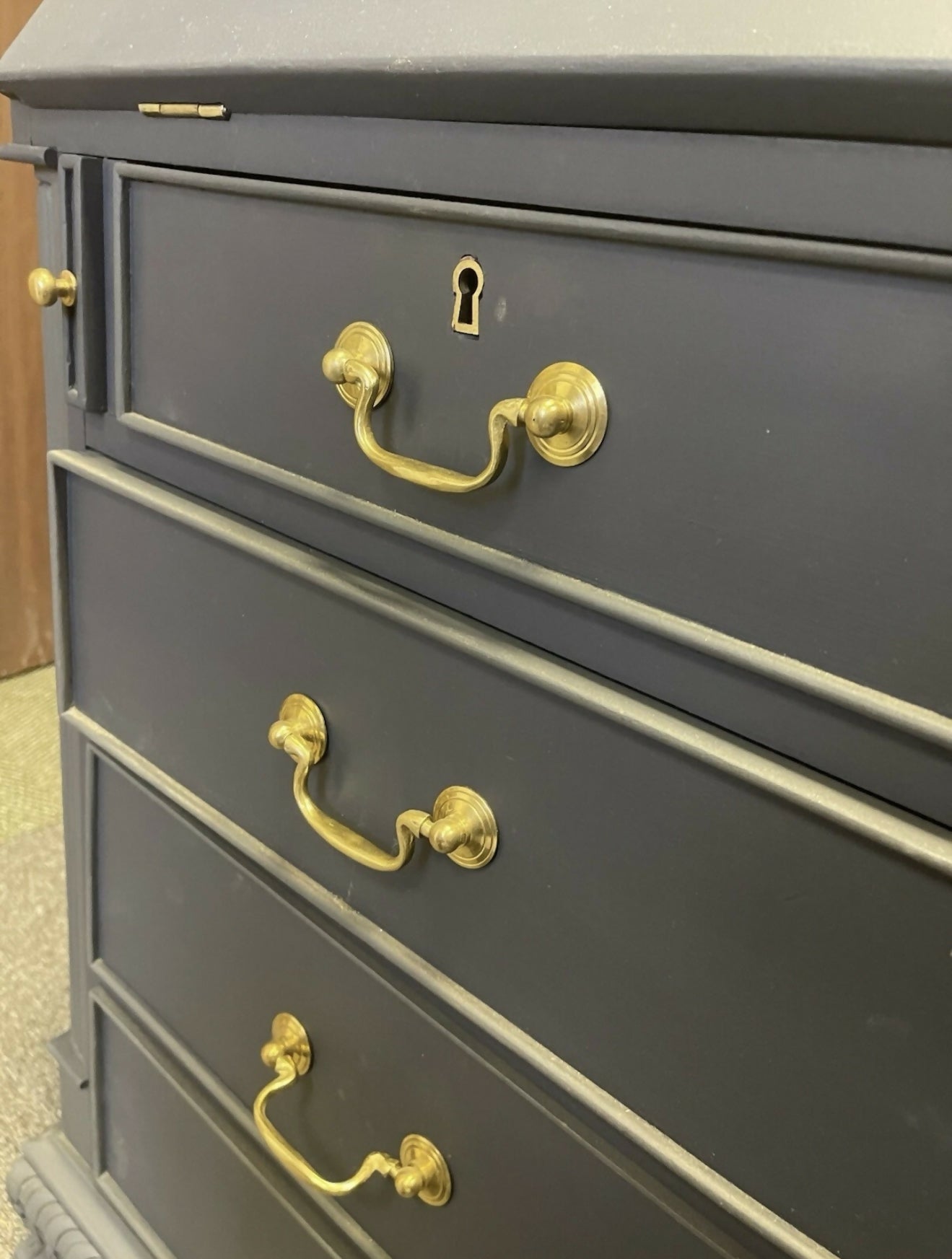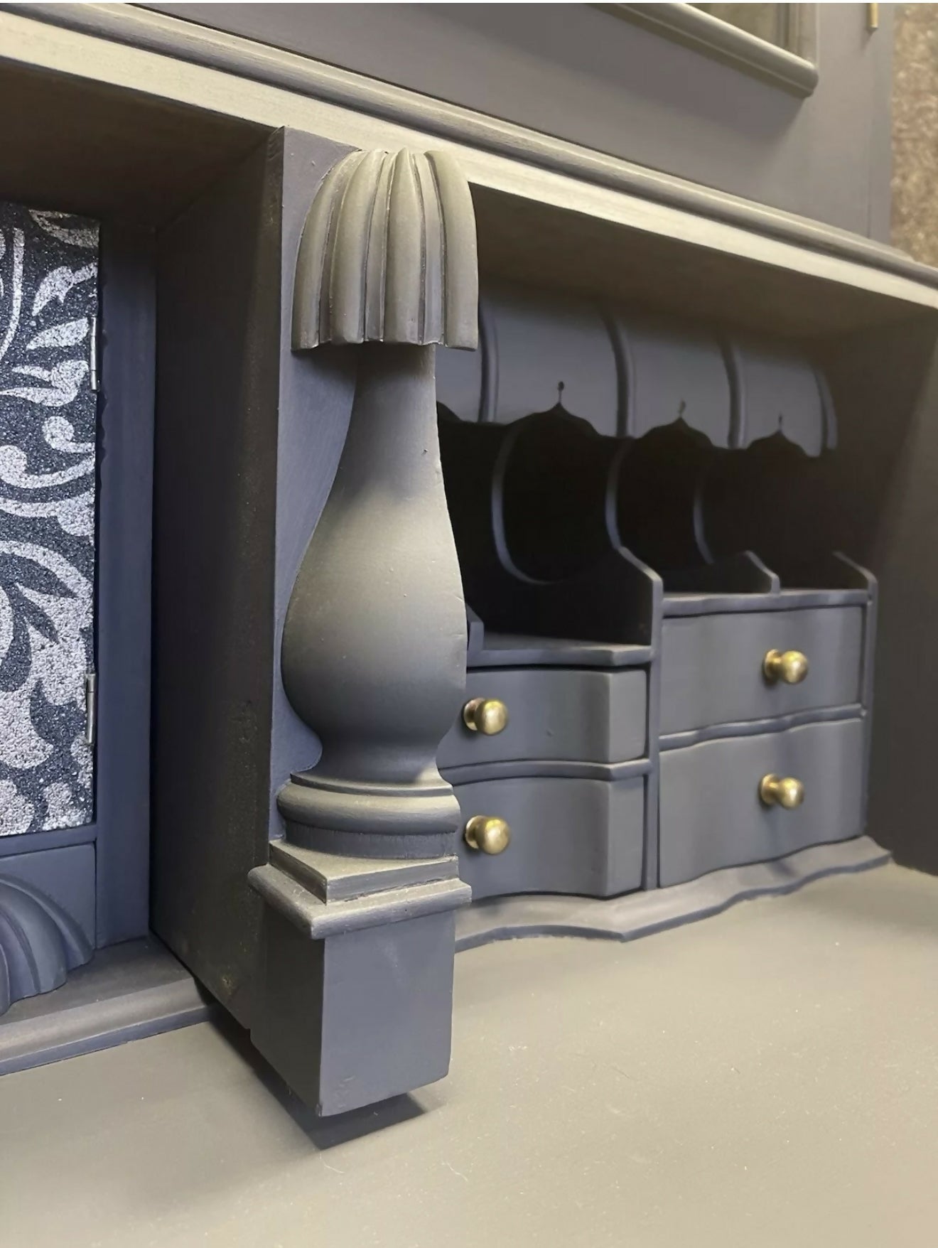 A unique opportunity to adorn your home with a stunning yet fully functional item of furniture that has been fully restored to an extremely high standard. This free standing writing desk with bookcase has been finished in a rich navy blue with grey detailing and brass fixtures. The lower section encompasses a fully equipped writing desk with 8 small drawers and an additional 5 concealed drawers, and a small internal cupboard. Below the writing desk are 5 drawers. The bookcase section comprises of 2 internal shelves that are removable and 2 glass lockable doors with gothic styled mouldings. Standing tall at 230cm this is a one of a kind item suitable for a well organised home office or just storage with style. Dimensions Height 230cm, Width 98cm, Depth 50cm Desk top 92cm x 35cm Internal on the bookcase: Height 95cm, Width 86cm, Depth 22cm Delivery We can deliver to most places in mainland UK for £140 This does exclude the Highlands, Far Northern Scotland, Cornwall and Wales however we deliver to these places for an additional fee. For an accurate delivery quote please send your postcode. Our quotes are based on flexible availability of a two man delivery service to your door, It is not down to the courier to take items upstairs and or assemble furniture. Congestion zone charges would need to be added if this applies to your area. We aim to have your item/s with you in 7-10 working days once payment is received. Collection is absolutely fine just contact us to make arrangements. Any additional questions please feel free to contact us. |