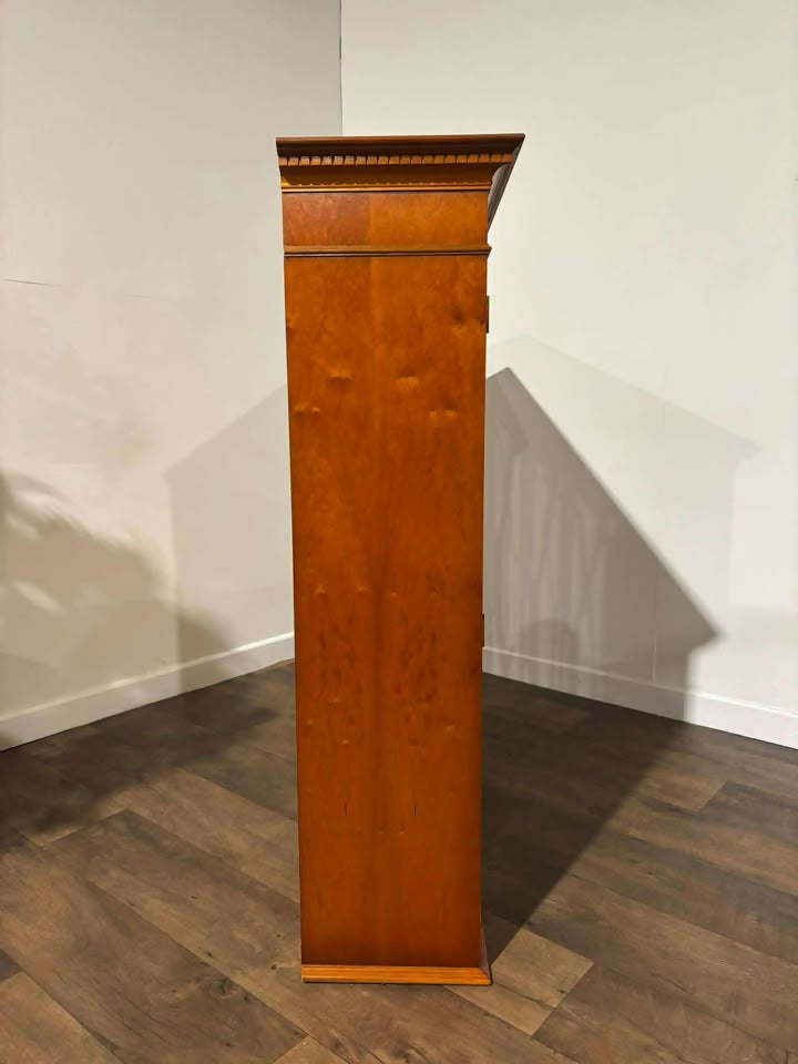 A beautifully made yew wood display cabinet featuring three astral-glazed doors that open to reveal six fully adjustable glass shelves — perfect for showcasing glassware, collectibles, or fine ceramics.